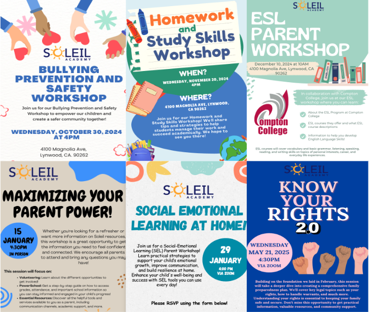 Parent Engagement at Soleil Academy looks different every month! Here is a glimpse of Parent Engagement this year: